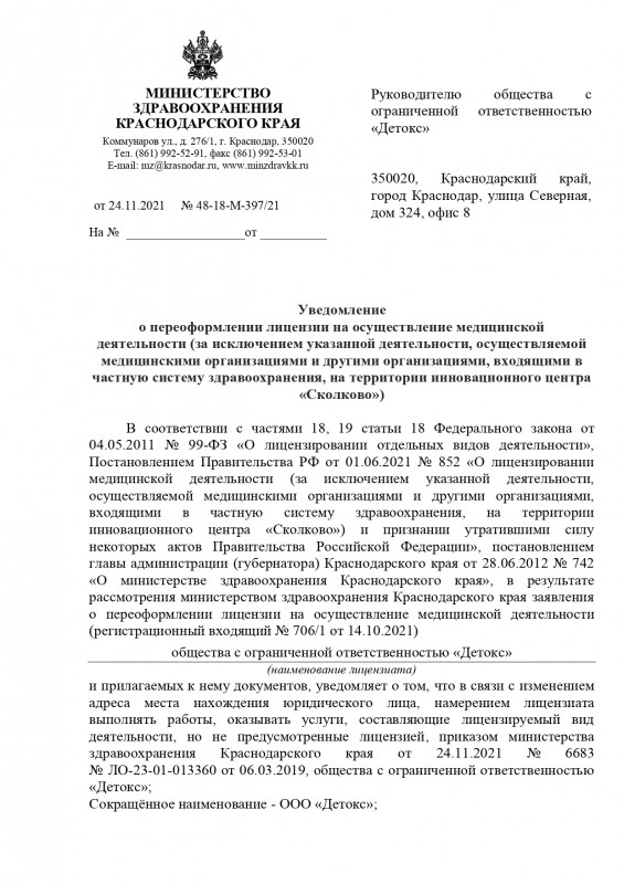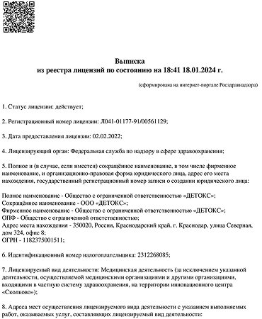 Медицинская лицензия наркологической клиники «Детокс»